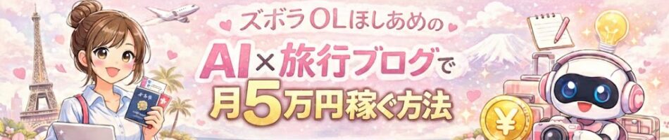 AIに旅行ブログを書かせて月5万円稼ぐブロガーです。 スマホで1記事15分・月50記事ペースで投稿しています。 AIとの二人三脚の日々を発信中